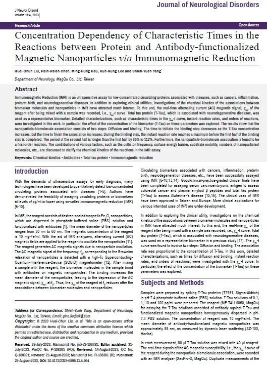 Yiran Gan 4/8/25 Yiran Gan 4/8/25 Longitudinal assessment of plasma biomarkers for early detection of cognitive changes in subjective cognitive decline Read More Yiran Gan 4/8/25 Yiran Gan 4/8/25 Differential neuropsychiatric associations of plasma biomarkers in older adults with major depression and subjective cognitive decline Read More Yiran Gan 4/8/25 Yiran Gan 4/8/25 White matter alterations and their associations with biomarkers and behavior in subjective cognitive decline individuals: a fixel-based analysis Read More Yiran Gan 4/8/25 Yiran Gan 4/8/25 Target engagement and immunogenicity of an active immunotherapeutic targeting pathological α-synuclein: a phase 1 placebo-controlled trial Read More Yiran Gan 4/8/25 Yiran Gan 4/8/25 The Ratio of Plasma Amyloid-β 1-42 over Serum Albumin Can Be a Novel Biomarker Signature for Diagnosing End-Stage Renal Disease-Associated Cognitive Impairment Read More Yiran Gan 4/8/25 Yiran Gan 4/8/25 Thickness, Annealing, and Surface Roughness Effect on Magnetic and Significant Properties of Co40Fe40B10Dy10 Thin Films Read More Yiran Gan 4/8/25 Yiran Gan 4/8/25 Studying the Effects of Annealing and Surface Roughness on Both the Magnetic Property and Surface Energy of Co60Fe20Sm20 Thin Films on Si(100) Substrate Read More Yiran Gan 4/8/25 Yiran Gan 4/8/25 Analyzer-to-Analyzer Variations in Assaying Ultralow Concentrated Biomarkers Associated with Neurodegenerative Diseases Using Immunomagnetic Reduction Read More Yiran Gan 4/8/25 Yiran Gan 4/8/25 Elevated plasma neurofilament light chain in immune-mediated neurological disorders (IMND) detected by immunomagnetic reduction (IMR) Read More Yiran Gan 4/8/25 Yiran Gan 4/8/25 Concentration Dependency of Characteristic Times in the Reactions between Protein and Antibody-functionalized Magnetic Nanoparticles via Immunomagnetic Reduction Read More Newer Posts Older Posts