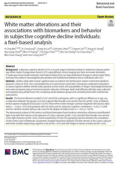 Yiran Gan 4/8/25 Yiran Gan 4/8/25 White matter alterations and their associations with biomarkers and behavior in subjective cognitive decline individuals: a fixel-based analysis Read More